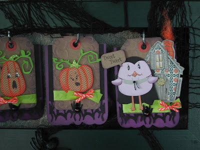 For my project, I updated my school themed banner frame to celebrate "Twick or Tweet" time. My die cut bird faces are from PK-134 Bird Faces and MORE! The vampire bird has his 'fangs' that are just snips of paper added to the beak and he is standing in front of his spooky birdhouse from PK-132 Twick or Tweet Birdhouse. Keeping with the Halloween theme, the die cut pumpkins have adorable faces from PK-550 Pumpkin Faces.