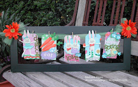 Hello crafty friends. I just updated my banner frame with a spring theme. The spring kit April Avenue is so cute, I knew it be perfect for my spring projects. Banner tags are premade and covered with patterned paper. The edges of the tags are trimmed with On the Edge dies from Sizzix. The rabbit's faces are stamped with Peachy Keen Stamps, PK-751 Animal Faces. A black marker was used to add eyelashes to create a girl bunny face.